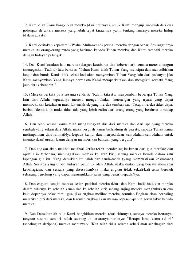 And (2) find the intertextual relationship between the playwright and the quran text and its interpretation as hipogram. Nah bagi anda yang ingin membaca surat ini secara online, disini saya sajikan teks bacaan surat al kahfi arab latin. Kisah ashabul kahfi mendapat perhatian lebih dengan digunakan sebagai nama surat dimana terdapat tiga kisah tersebut. Cerita dzulkarnain dengan ya'juj dan ma'juj. Kami sampaikan cerita ini kepadamu (muhammad) kisah mereka dengan sebenarnya. Yang dihormati tuan pengerusi majlis, para hakim yang. Mereka hidup ditengah masyarakat yang menyembah berhala. Cerita ini mengkisahkan beberapa penghuni gua yang mengandung i'tibar dan pelajaran yang amat berguna bagi kehidupan manusia. اصحاب الکهف, aṣḥāb al kahf) adalah kisah 7 pemuda yang tertidur lelap di dalam gua selama 309 tahun. Kisah ini terjadi sebelum zaman nabi muhammad salallahu'alaihi wassalam. Ali bin abi thalib meneruskan ceritanya: Kisah ashabul kahfi mendapatperhatian lebih dengan digunakan sebagai nama surat dimana terdapat tiga kisah tersebut. Ashabul kahfi disebut dalam alquran dan menjadi sebuah ayat khusus al kafhi.