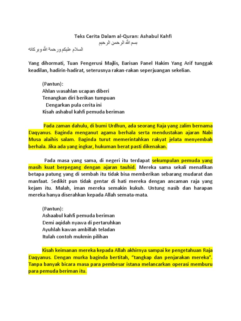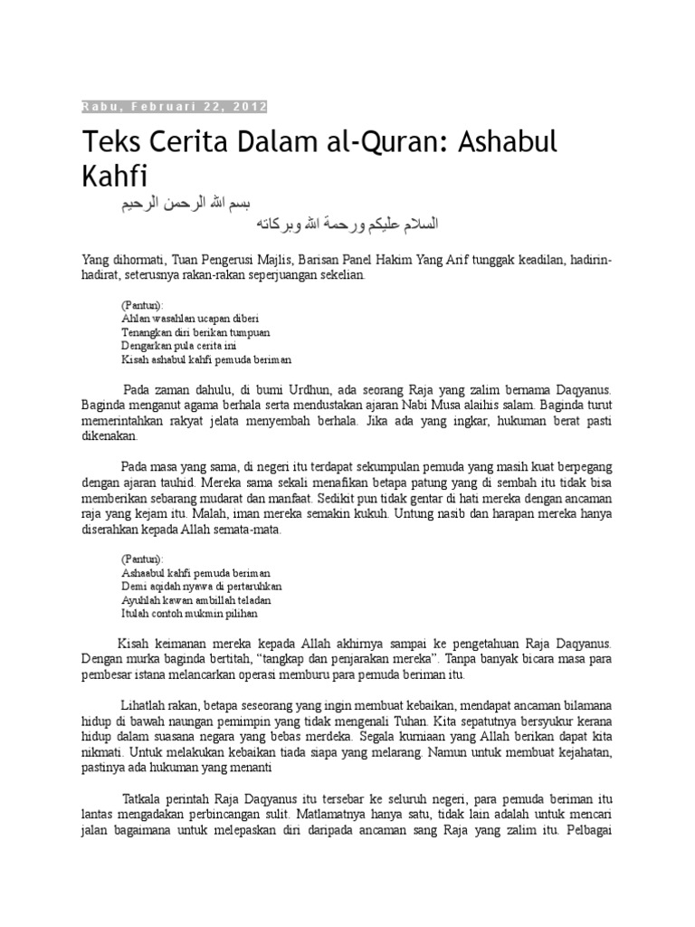 Teks Cerita Ashabul Kahfi / Ashabul kahfi, kisahnya mengajarkan bahwa manusia harus mempertahankan agamanya, sekalipun dia harus terusir menyelamatkan agama adalah suatu kewajiban dan harga mati.. Ashabul kahfi bukanlah kisah epik jenaka, dongeng atau suatu cerita rekaan manusia. Ia menyuruh kepada masyarakatnya tunduk dan patuh kepada perintah raja untuk menyembah berhala dan ritual penyembelihan hewan. Yang dihormati tuan pengerusi majlis, para hakim yang. Terdapat juga kisah musa, khidir dan dzulqarnain. اصحاب الکهف, aṣḥāb al kahf) adalah kisah 7 pemuda yang tertidur lelap di dalam gua selama 309 tahun.