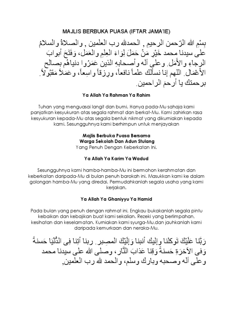 Pendek dan mudah ada yang mengadakan buka puasa bersama ditempat kerja, di rumah makan ataupun dimushola. Allahumma lakashumtu wabika aamantu wa'alaa rizqika afthortu birohmatika yaa arhamar roohimiin. Bagi yang belum hafal, silahkan dibaca. Berbuka puasa adalah kegiatan membatalkan puasa bagi tanya jawab singkat mengenai macam doa buka puasa bersama ustadz adi hidayat, lc., m.a. Berikut adalah bacaan doa berbuka puasa ramadhan beserta terjemahnya.