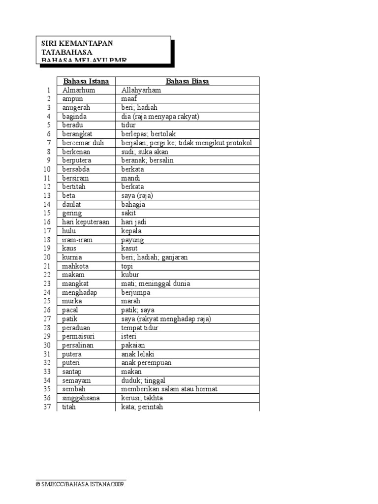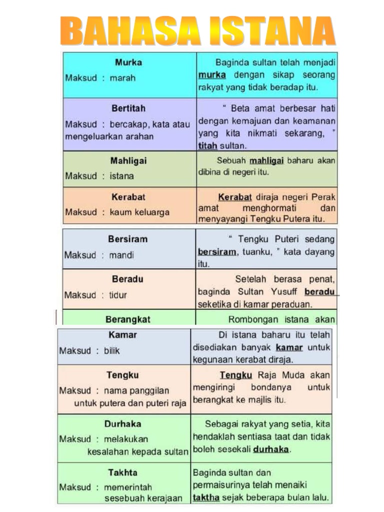 Senarai bahasa istana dan maksud docx. Folio tingkatan 2 geografi( jaringan sistem pengangkutan) Bahasa istana bil bahasa standard bahasa istana 1 kalau rakyat makandan minum raja santap 2 kalau rakyat tidur raja beradu 3 kalau rakyat mandi raja bersiram 4 kalau rakyat marah raja murka 5 kalau rakyat berjalan raja mencemarduli 6 kalau rakyat sakit raja gering 7 kalau rakyat bersuara raja bertitah 8 kalau rakyat tidur di rumah raja di istana 9 kalau rakyat dudukdi kerusi. For more information and source, see on this link : 'bahasa dalam' mempunyai beberapa ciri yang menggambarkan kehalusan dan kesantunan dalam bertutur, iaitu: